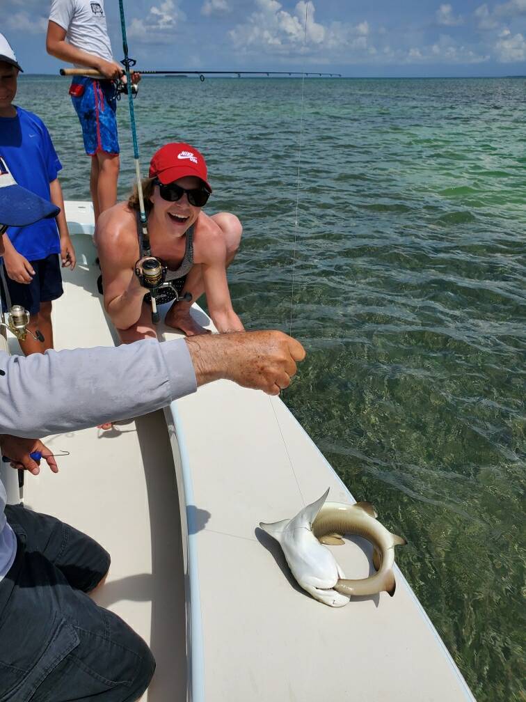 Liz and Charlie traveled all the way from Colorado to fish with TwinstiGator Charters and sample the summertime Keys action. Liz and Charlie caught their very first sharks and were on top of the world. As you can see above, Liz was amazed to see how sharks have no problem nibbling their tails.