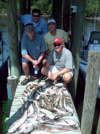 Fun Friday on the Beach. Ben garrison, Ryan Trott, George Ingrish, and Justin Dekeyser were onboard. We started off with a stop by Campo's for bait then hit the marsh. Our first stop was where I found some nice Trout a couple of days before. It only produced 1 Trout and 1 Red so we made a short move. The shrimp were jumping out the water all over the place. The Trout were eating up both under a cork, and on the bottom with a Carolina rig. Threw some plastic at them and they were tearing it up, both Gulps and Bayou Chubs just threaded onto the same Kahle hook Carolina rigs we were using. Everyone switched to plastic and fish were flying in the boat. The Trout were nailing the bait as soon as it hit the water, or shortly after as the bait fell. Lots of those 15" Rat Reds on the bottom too and there were some nice Reds 20"-26"mixed in to make the Okuma reels sing. Lots of action, one pretty box of fish, and lots of fun had by all. Total catch 125 Trout, 6 Reds, 4 Drum.
