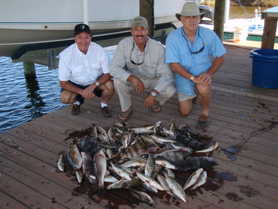 Fun Wednesday on the Beach. I picked up Jim Walther and his guests Gary and Kelly at Jim's camp. We headed over behind Hopedale in Lake Robin. We did not find any Trout, but did find some nice Puppy Drum. We then moved on and hit several spots with little to show for. We fished a lagoon off the Twin Pipeline and got on a good bite with Campo's live shrimp under a cork. Somewhere along the line we must have run into some bad water that killed most our shrimp. Good thing the Trout did not notice. The guys had a great time and put together a nice box of fish, 75 Trout, 6 Drum, 2 Reds, and 1 Head.