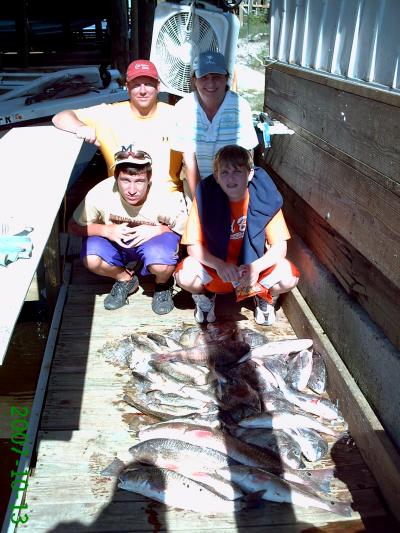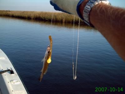 Fun weekend on the Beach. No charters for me last weekend, just fun fishing with friends. Saturday I was fortunate enough to take one of the CF families out fishing for the Cystic Fibrosis Foundation Hook A Cure Rodeo at Breton Sound Marina. We all had a great time and caught plenty fish. Jonathan won a nice prize for the Redfish with the most spots. Sunday I got to fish with a few friends Mike, Bob, and Gary. We fished hard, had a great time and caught lots of fish. I even caught the smallest Trout I have ever seen on a hook. It hit a Bayou Chub and was no longer than the Chub, see photo. Thanks Bob for the great food over the weekend, Eman can cook!!!!
