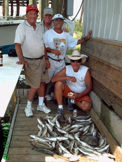 Fun windy day Tuesday on the Beach. Cyrus Vernaci's kids bought him this trip for his father's day gift. He brought along his brother Pete Vernaci, and friends Jerry Solar and Phil Hoz. Once again the SW wind was blowing. We fished a few semi protected areas in Eloi with Campo's live shrimp both under cork and on the bottom. The conditions were tough, but by the end of the day we had a nice box of fish, and everyone had a great time. Total catch was 63 Trout, 2 Sheepshead, and over 30 White Trout and Channels.