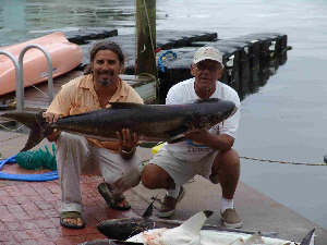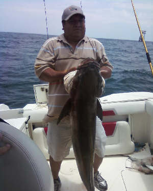 May 24, 2009 Had 4 great trips that ran today everyone who went offshore up to 50 today limited out on kingfish and ling, captain Jesse also brought in ling and kings and 1 blacktip shark around 4-5'. All the guys got photo's of their trips today I will be posting these up soon. The biggest ling went 51 lbs it was a hoss brought in from 50 miles and the smallest on any of the boats went around 35 lbs. still not a bad ling. Captain Bill was kept inshore until permits come in for the boat bringing in limits of bullreds all tagged,gaftop,croaker. All the guys commented on the weather and the customers made choices to weather it and stayed out. Now this weekend we had some real troopers out there. Guess no one melted hahaha rain was very heavy at times and did hinder fishing at times but, no one came in empty.. This is the 51 lb ling dan brought in for the Hall of Fame Tournament well we saw today