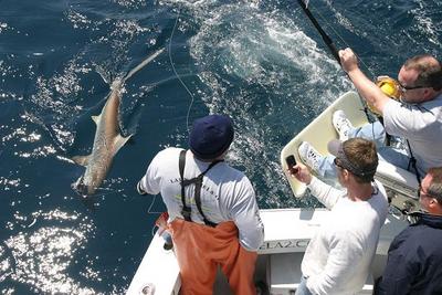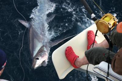 During our morning trip, we were very successful with a Game Shark bite and two nice fish on the wreck. This afternoon, Carl, Pete, Jim and Mark joined the Lady Pamela II for round two and we were anxious to see what was biting. We trolled for one hour without any takers. We tried bait fishing, not even a nibble. However, we didn't get discouraged, our morning trip started out slow as well. I decided to move into deeper water and drop a big bait below. For two whole hours, we were fishing and not catching. Then unexpectedly, our bait intrigued a Thresher Shark with one helluva temper. Mark was the first angler to call dibs on the rod. Mark gave it a shot then gave it away. It took all four of our anglers to catch this monster fish. It wasn't easy, but they did it, nice catch guys!