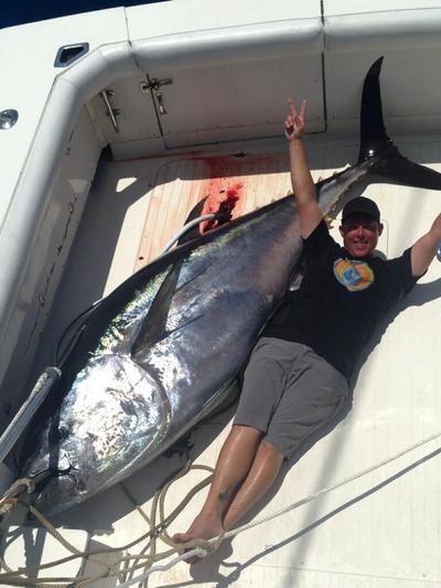 A giant tuna was caught by Capt. Rod aboard the Kaydiddle on a fishing trip that left Fort Lauderdale. The boat went 60 miles offshore, to just outside the Bahamas. Giant tuna come through the pass between the Bimini islands out into the Gulfstream current on their migration northward. On this fishing mission, most of our fishing was done without even baits in the water. We patrol the waters with baits ready to launch if we see a tuna coming through. These tunas are moving incredibly fast, more than 20 knots. The boat has to go full throttle to get in front of them and drop back our baits. Well, luck was on our side that day as we sighted a giant tuna coming off the bank. We gunned the boat ahead and got in front of him and dropped the baits back to him, right on top of his head. INSTA-BITE!!!