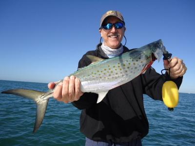 We made a short run to St. Pete Beach and anchored up in 22'. The water temp was right at 67 degrees at 7 am. With only one angler long time friend Dave on board Captain Steven picked up a rod and joined the fun. Its also very competitive between the 2 of us. The first bait in was crushed by a Spanish Mackerel within 2 minutes of hitting the water. With the drag screaming we were surprised it wasn't a Kingfish instead a large 6 pound Spanish Mackerel.
