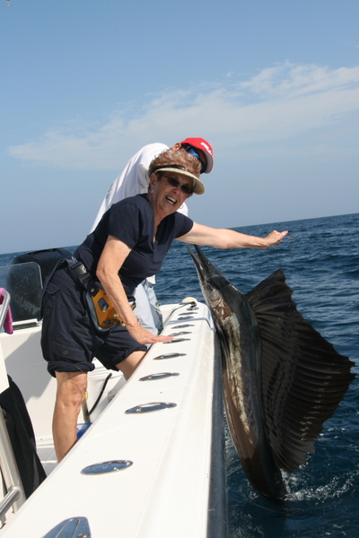 Normally in April and May we start to also see more variety in the fish that we catch, and lately it seems that spring may have started early since we have been catching other fish besides sailfish. There have been some kingfish around and we have caught at least two big smoker kings (over 30 pounds) since the last report. There have not been as many dorados around as I would have thought, but the ones that are being caught are decent schoolie size and bigger. The one fish there has not been a shortage of lately are bonitos. When the sailfish bite is going off, bonitos can be a nuisance, but they do fight hard and definitely test your tackle and skills. There have also been a few wahoo around including a 30 pounder we caught a week and a half ago. We have also had reasonable success on the bottom, catching a few very nice mutton snappers and releasing some decent size groupers as well (groupers are out of season).