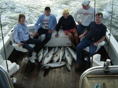 The bluefish are still really active from Henderson's Rock up to the Path. The most activity is up near the Path out in 20 feet of water. Single hootchies and swimming plugs trolled at around 5 knots will work well. Plugging for them can also provide you with a good number of bluefish. The Sunken Meadow area is quiet right now, however there are some fish up by the #12 can leading into Welfleet Harbor. The bass that are on the shoals now will not stay there forever. In a few days they most likely will move off the shoals and back into the deep water. This wind we had pushed most of the bait elsewhere and it will take time for the bait to work its way back to the shoals. Then we're back to the same hunt we had before until the next northwest wind. This time of the season we should get a few more big winds that will push the fish into the shallow water of Billingsgate Shoals. One reason August is a good month to fish Cape Cod Bay.