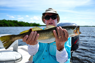 Bluefish (good size ones for our standards), snook, mangrove snapper and flounder were also caught on live pilchards from the same areas. About anywhere you spot bait pods over the deeper grass flats you can expect fast action with Spanish mackerel, ladyfish and small sharks, just look for the birds or the rain on the water.
