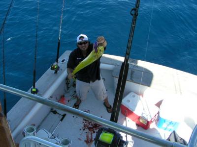 We started off first thing in the morning setting lines in 80' of water and heading east at 5 knots looking for rips and weedlines or diving birds. After hitting 100' of water we deployed our dredge in hopes that this would be the added attraction needed to draw the fish to the baits. Shortly after doing so we had our first Dolphin hook up of the day with a nice cow being brought to the boat hitting a naked ballyhoo. We continued to work the 150' depth and working East to West ended us up in 200' where we looked back and had a 150-200 pound Blue Marlin up in our dredge going nuts. we quickly presented the largest ballyhoo we had aboard, however the fish refused to eat. We continued to work the area and raised a nice Wahoo in the 50-60 pound range. After the bite going quiet in deeper waters we proceeded shallower and when we hit 140' we had 2 Dolphin hook up almost simultaneously. We continued to work the area seeing a few free jumping Sails that would not eat and lots of Hammerhead sharks from 6-12' in length. We ended up the day with 3 Dolphin, 1 nice Wahoo and a Blue Marlin raised. Other charter boats in the area came in skunked or with 1 small fish.