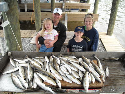Started hitting the points and were back on trout. We set up and the action was pretty fast on some nice trout for awhile and the box was looking good but the wind was really kicking 20-25mph. So I headed for the lee shorelines and did some drifts which produced the biggest speckled trout of the day 2-3 lbs to top off the box. It looked like the rain was going to make a show so we called it a day around 1 pm and headed in. Nice family outing, I loved putting those kids on good mess of speckled trout to take back home to Georgia. All fish caught on chartreuse plastic's under corks.