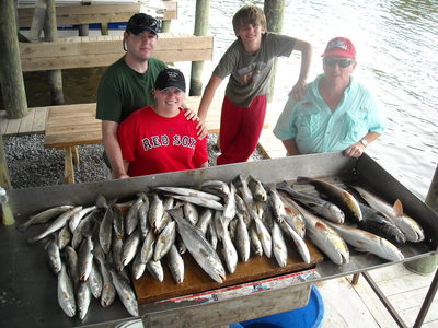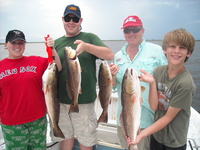 Yesterday Gene Usner took the day off from work to bring his family out for a day of fishing. We got off to good start with the trout fishing under the birds but a lot of small fish. With the tide still rising our next few stops produced more trout at each one. Tide stopped so I headed out to find the falling tide and got back on the trout at a gas well in Black bay. The bite was slow but steady; problem was so serious weather was bearing down fast. Stayed as long as possible building a box. Made a run toward the dock away from the weather and finished up with some nice redfish and drum to top things off. Barely got rained on at the end but it felt good cooling us off a bit.