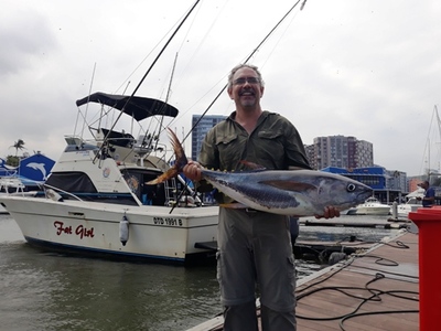 Flat seas, light winds, overcast skies. Inshore fishing was dead and the water was not looking a good colour and the temperature was 23.5deg.C. So we decided to head out to the deep where the SST charts showed warmer water and from 400m depth we found beautiful clear purple water at 26.3deg.C and we fished this area right up to the 500m depth. Loads of life all around in the area; a wide variety or birds were seen, big schools of dolphins, massive manta rays, turtles and we saw some very big sharks. Oceanic Bonito were around in abundance and we hooked up and lost many of them when all the lines went screaming but we also managed to land a bunch. We also got 4 Yellowfin Tuna with 2 really nice sized ones that really sealed the trip as a good one giving the anglers a good rev and arm stretch.