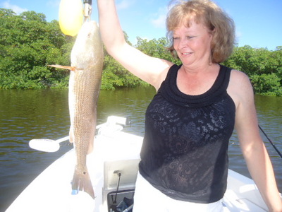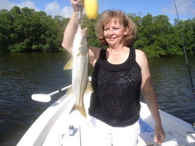 With a strong high incoming tide we targeted Mangrove Islands. Our first stop resulted in 2 redfish a trout and a stingray. Ronnie had bragging rights so far with the bigger redfish. So far was the key word. Our next stop again on Mangrove islands Linda caught a chunky 21" snook that inhaled her white bait. Linda quickly followed that with a solid 24" redfish. The chunky red missed the bait the first time and turned right around and slammed the bait. Now Ronnie needed a snook and Linda needed a trout to complete their slams.