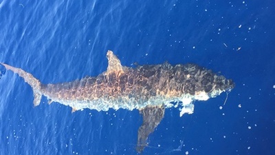 Our first drop offered us quite the surprise. In almost 800' of water fishing the bottom, only a few bites were shaking the tip. As our prey was retrieved, a surprise showed up along with the 2 Rosies we'd caught… A very large Dusky shark! We threw a few pieces of cut bait in to keep him interested and asked if anyone would like to catch this large creature. The response was YES!