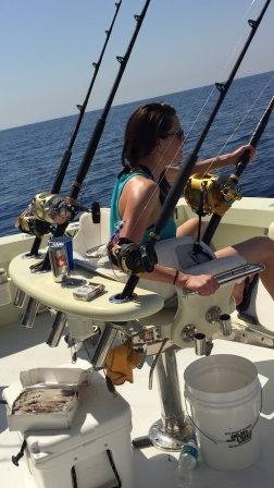 So Darren quickly rigged a bait and pitched it on the right tackle to this shark that was hanging around waiting for more food. And who gets the call to fight the fish first? Amanda. Little Amanda who might weigh 100 lbs. Maybe.