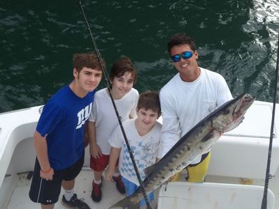 Ok there is more than one way to skin a cat so we went inshore and set out some small live bonitos and slow trolled them inside the inlet. All of a sudden BAM the water exploded and this monster barracuda came leaping out of the water a good 5 feet in the air.
