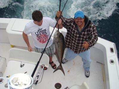 We started out trolling the reef but as our luck would have it today the kings and bonitos just were not biting. So we decided to try trolling off shore in hope of finding some dolphin fish but once again we just could not seem to find any fish today but we were determined to catch these guys some fish. So in came all of our trolling gear and we ran to a ship wreck that rested about 210 feet down on the bottom. We sent down a live blue runner and before we even knew that we were at the bottom we were Hooked Up.