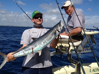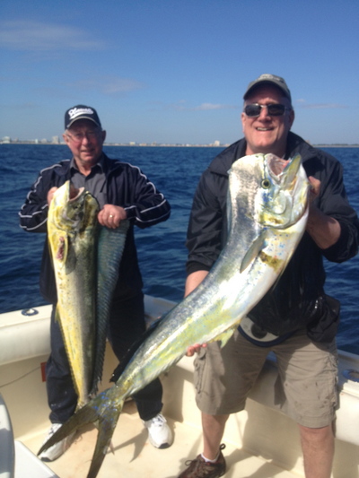 Some big predatory fish showed up today, as the Lady Pamela II caught a few 30 lb. mahi-mahi, plus a few others that went over 10 lbs. The kingfish were around as well, and they were happy to take baits trolled over the reef as we headed out for sailfish. We boated a couple of nice fish, close to 30 lbs. Today's highlight though was the three sails we hooked up off the kites. It was awesome to see these fish crashing the surface, all lit up, with their sails raised.