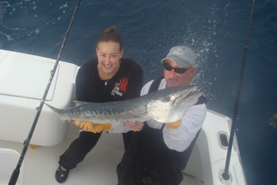 This time Nicky got the rod and the fight was on. Nicky ended up catching a big barracuda on 20 pound test rod. Way to go guys and thanks again for fishing aboard the Hooked Up.