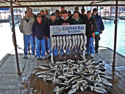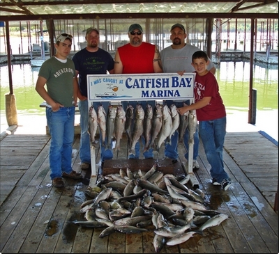 Yesterday's group got down to their last 20 live baits but since we had only been out a little over an hour I suggested they cut up the rest and try for some catfish. We went to cut shad right off the bottom. Only got 2 catfish but the sandies loved it. Pulled 43 Sand Bass on cut baits.