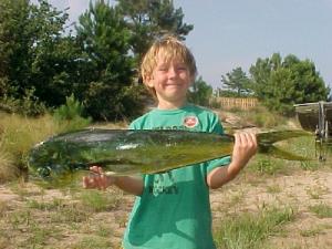 The Striped Bass fishing in the inlet has been slim pickings at best. I'm not sure what happened to the big ones we were catching. The Cobia and Spanish outside the inlet have been hard to find, so Sunday we decided to try something different. We headed out about 18 miles and found some hungry Kings and some nice size Dolphin. We loaded up and were back to the dock in a few hours. It was nice to have a fish that could give you some fight. Here is my first mate Bryce, holding a nice Dolphin.