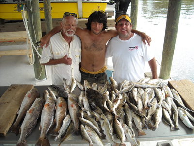 Barry Green his son Chad and friend Ron were right on time and ready to go get 'em. Conditions looked good so I headed to where I left the trout a few days' back. They were there and hungry it was on with the first cast to the last. Shrimp under corks or plastics it did not matter. The guy's were having a ball and trout were flying in the boat it did not take long to fill the limit with nice speckled trout. Off to the marsh to look for reds. We hit a couple here and there before calling it day with a full box of fish and good times.