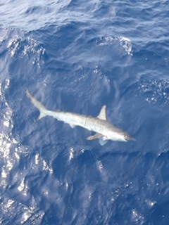 We continued fishing with all our lines still in the water only a little deeper from where we started. On the long surface bait, we saw another dorsal fin belonging to a Hammerhead Shark. The Shark started feeding on the bait - we were hooked up. The angler started fighting this Shark. He was pulling out line and the reel kept screaming out drag. The angler got this Hammerhead Shark up along the side of the boat for picture taking – we released the Shark and he swam away.