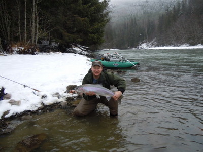 Dec 16 Ariel Kuppers and Justin Lowes hooked 19 Trout and landed 8. They were fishing with a Gibbs http://www.gibbsfishing.com/ Float and the "Kitimat Combo" which is a 3" Berkley http://www.purefishing.com/ Power Bait Worm and a Dew Worm from Bubba's Bait Barn http://www.bubbasbaitbarn.com/ . Ariel also hooked a few with a "Pink Worm" pattern that he had tied. Ariel was using a Dragonfly 9' 8wt Rod with a Dragonfly Expedition Fly Reel made by Redl Sports http://www.redlsports.com/ . He was using a Scientific Angler Sink Tip Fly line and Cortland http://www.rapala.ca/ backing. Both Ariel and Justin were wearing fleece made by Simms http://www.simmsfishing.com/ . Well done guys. Congratulations!