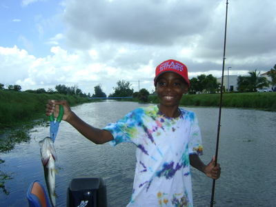 The tempature was in the 90's water tempature was in the high 80's. Jassin Person had never caught a Largemouth bass. He talked his dad into a trip on his last day of a family vacation. He can now say he caught a Largemouth. After missing a few fish due to excitment he landed a couple. It was hard fishing, but he got the job done.