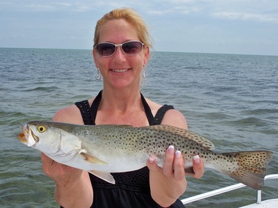 The trout bite has been fantastic in 6 - 10 ft of water. Drift the grass flats with sand pockets. I prefer to throw a white GULP on a red 1/4 ounce jig head. Cast to the pockets of sand and slowly work the bait across the bottom. This method will also draw strikes from mackerel, sea bass, lady fish, juvenile grouper, shark, and a variety of other species. The best part of fishing the deeper flats like this is because of the non stop action and the variety of fish you will catch.