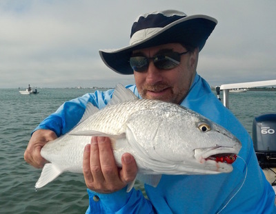 We got 10 or 12 redfish. Scott simply pinched a couple big split shots near his hook. I used a 3/8 ounce jighead with a finger mullet for a tail. Both ways worked. Scott got a flounder, too.