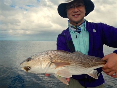 We went against the shoreline. As one might guess, because of the high, dirty water, the east wind, and the clouds it was very hard to see. In spite of that Makoto spotted several redfish. One of the nailed his crab pattern and he got it.