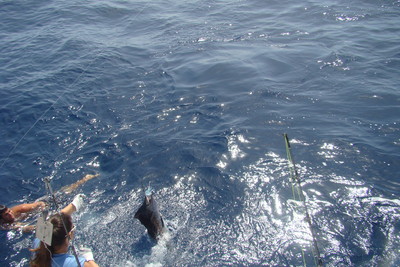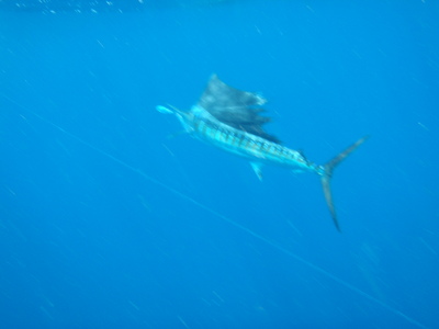 The ship happens to pull anchor as we make another pass by her and Captain Taco decides to go further off shore to find better looking water. We're heading out and the boat is scaring up Flying fish which is pretty common. I ask the Captain about the Flying fish when he tells me to look 300+ yards to the right where there was something else scaring the Flying fish out of the water. He makes a hard right and we head for that spot. Before you know it, Bam, fish on! By the time I could turn around, I hear "Sailfish" and Samantha's friend, Jessica jumps in the chair and the fight begins.