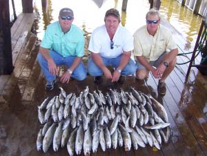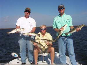 Mike Whigham brought along Matt and Scott Cassidy from the Mobile area down to Hopedale to sample some of the Awesome LOUIANA SPECKLED TROUT and REDFISH action we have been this fall. Well the weather was looking iffy but we were determined and headed out in the gale force winds 25 mph +. First stop fish on the trout were hitting plastic jigs dead on the bottom in 7 ft of water. We stayed there for a while moving around abit but the bite died. ON the hunt 4 stops later I had the guy's back on the fish but this time it was to be plastic under corks drifting some protected lake off the Twin pipes. We would catch 10 to 15 per drift and before long the guy's had a limit of nice trout on ice, some up to 4 lbs. Time for reds did the troll the shoreline thing throwing spinners and spoons catching several and releasing them all but one that Scott wanted to grill. Oh yea we caught 3 chunky Bass too. The guy's loved it this were there first trip to Hopedale but not the last!
