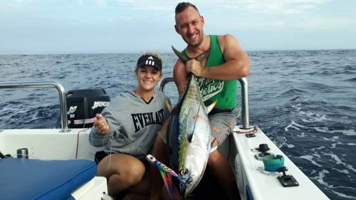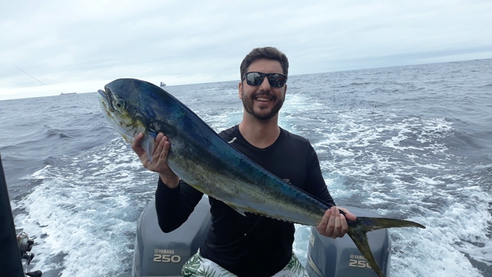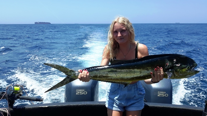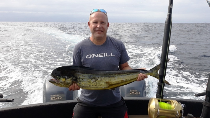 With the weather against us on many days with strong NE and SW winds and some really choppy seas the last 2 weeks have been very busy and we have done a lot of trips between the boats even with days that the weather did not allow for a trip. For the first time in my life I encountered water of 27.6 deg.C straight out the port, usually we find this warm water 50km out. Dorado have been around and have been regular catches on all trips along with a few Yellowfin Tuna, this seasons Dorado have been on the small to medium size with many little rats and the better ones only 4-7Kg with the odd one bigger, the Yellowfin Tuna have been scarce. The Oceanic Bonito arrived during this period which is a very good sign as this means that Black Marlin are around, we have been catching a lot of these with many multiple hook ups which is always great fun on the boat. Nawty Girl hooked up a Sailfish and on the same day Fat Girl hooked up a small Marlin almost at the same time, sadly both fish came off on the jump. Bottom fishing has been a bit slow but some nice fish have come out. The highlight for this holiday period was a really nice Yellowfin Tuna of 14Kg on Nawty Girl. This hot weather the past few days is caused by the Agulhas current being so close to shore along with the very warm water temperatures and I think a nice cold front will do wonders for the fishing and give the fans and air-conditioners a break. By the looks of things we may have a longer season than usual and the Dorries will be here for longer, I hope so anyway.