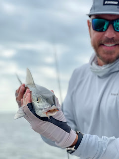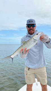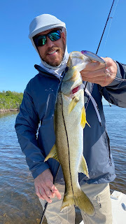 The last time Ted and I fished (for the first time) it was an absolute grind and we managed one snook on top water. Today as he jumped aboard my skiff that was a topic of conversation and the trip started off pretty rough again. The first few spots had zero life, no bonefish so far. Dang! OK, we moved on to look for snook and again the first few spots were slow but finally we fished a creek mouth and we watch as a snook crushes his subsurface lure and makes a few nice jumps before the pic and release. This sure looks familiar, please God don't let it be a repeat of our first trip! Ok, we fish a couple of more spots and zero life. We start bonefishing again and we hook two nice bones that broke us off. Hmmm, OK there's life out here. At this point I tell Ted "Alright, we are committing to bonefish for the balance of the trip no matter what." Ha, it's funny I said that because we worked another flat and it was, well, hmmm, incredible! On this one flat Ted got two bonefish on spin tackle and then one on fly. With the spin tackle stowed we focused on fly and it was the best bonefish on fly trip I have had. At one point it was bonefish hooked or at least have an eat on almost every cast as the schools just kept swarming by us. WOW! The final tally, as best as we can recall since we were laughing and not keeping track was about 20 bonefish hooked and 12 landed, 2 on spin and 10 on fly. All we could do was scream, laugh and enjoy the bonefish insanity. If only every trip was half this good!