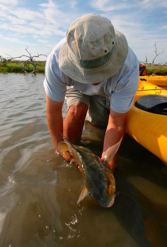 One black drum, two small reds, and a hardhead catfish fell for a black redfish worm in about six hours, with maybe three of four unsuccessful shots as well. It was pretty tough and very warm fishing.