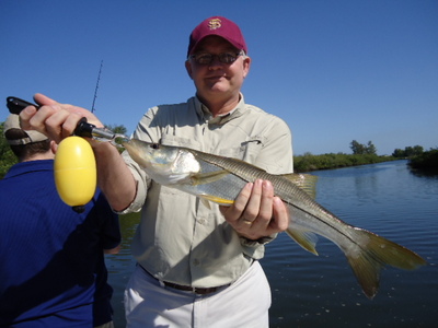 Captain Steven headed SE to Tampa Bay's eastern shoreline. Right off the bat John had his bait crushed but he couldn't help but jerk the rod. Circle hooks require you only reel…John looked me in the eye and said I did everything you told me not to do. 10 minutes later Rich had a big snook swirl on his white bait only to have a flared gill plate cut the line. Moments later John connected and landed a chunky 21" snook. A small redfish, several snapper and Ladyfish and that was it!