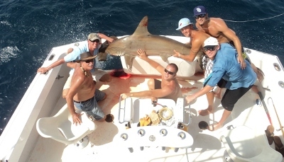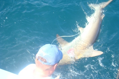 We decided to end the trip going for a sea monster. So J.J. brought in all our trolling gear and we set out a couple live baits along with a couple shark baits set down deep and last shark bait on the surface and that was the one that paid off for us.
