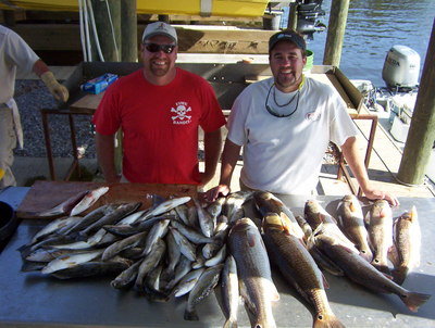Blake and Chris from TN are in the N.O. area working on the phone lines and wanted to sample the Louisiana fishing. I was already booked with a group on Saturday but my friend Capt. Tony B said he would gladly help and take these guy's fishing. Well they had a blast catching a limit of trout and near limit of nice redfish. Blake said the fishing was even better than he had heard about. They are planning to get a group of friends together when they get home and book another trip later this fall.