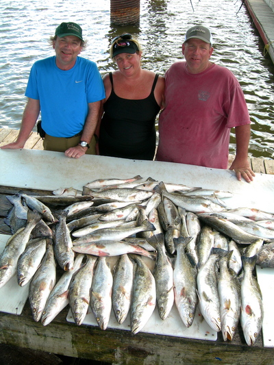 We then got on another good bite that was faster. The crew did a good job working the fish over while the bite lasted, and ended with a good box of fish for the day, totaling 58 speckled trout. All fish were caught with live Boogie Shrimp and Croakers, Carolina rigged.