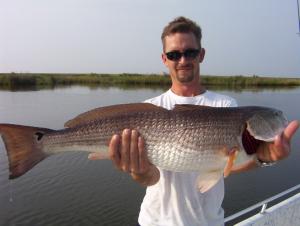 Fishing from a comfortable roomy 25 ft AVENGER BAY BOAT powered by a 225 HP MERCURY and using MARSH MASTER RODS and SHIMANO REELS