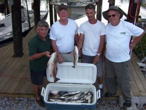 CPB CREW! Bubba, John, Rodney, and Biff down to Hopedale for a nice cool weather fall fishing trip. NOT well they got the fish but boy was it hot for Oct 3rd I think it got up to 90 today. We started off with a thick fog which kept us from running until about 8:00 AM. Went to where I left the trout only to find them not home. Moved around drifting a bit putting trout in the box for awhile but no hot spot. Decided to hit my redfish hole and found the reds, drums and sheephead eager to take our baits. But the crew wanted more trout so I decided to head outside. Found some nice trout at the islands and some under the birds too. Hit several places catching a few at each but no hot spots. Any way we had a blast and ended up with a box full of some good eating fish for the crew. Bubba said they will be back and hope the weather is a little cooler, never can predict the weather in south Louisiana.
