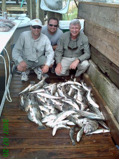 Hot fishing on the Beach Friday. Drew Cagnolatti brought his dad Bill and brother Devin down for some of the hot Trout action we have been on in Shell Beach. Conditions were great and so was the bait we picked up at Campo's. Our first stop was on the edge of the Sound were the Trout were eating up under a cork. Several also were caught on top water plugs. As the fish got smaller we headed out deeper into the Sound. The water further out was very dirty, but we found some big Trout. The bite was on the slow side, but the size made up for it. We finished up our limits as we ran out of bait. Total catch was 100 Trout, 2 Sheepshead, 2 Drum, and more fun than the law should allow.