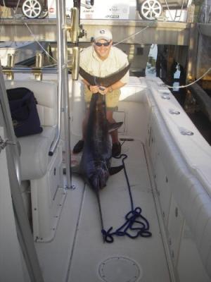 Jon Clement, one of my more frequent clients, made a detour from his work path in Tampa to come to Miami and fish once again for Xiphias gladius. He had caught a 110# fish with me 2 years before, almost to the day, to complete his offshore "super grand slam" (Sailfish, Blue Marlin, White Marlin & Swordfish) in 2004. He came alone and determined as he did before. We arrived at one of my drift sights at twilight and immediately checked out the drift and began setting out 4 lines. Drifting at approximately 2 knots everything seemed perfect. The first drift produced a slash and jerk from the tip rod. Jon jumped on the rod and got about 3 cranks and as he began to feel the weight of a fish, the hook pulled. No sweat, the night is still early. We continued the drift but it was was uneventful. We pulled the lines up and ran the 5 miles back to the head of the drift track and I mentioned that I had seen a place on my bathy map that I wanted to try in some deeper water. Jon, said "Let's give it a shot, I trust you." We had plenty of time for a good drift and set up again. The drift began to show what was evidently good bottom contours. About an hour into the drift with the moon reaching almost full overhead, we had the closest float rod make a couple of quick clicks on the reel. Jon, once again at the ready, put the rod in his belt and came tight on this fish and in 30 seconds it was over. Dejected, he looked at me with the "its' not my night" look. I told him that it was getting about time to quit but what the heck, let's do another drift. Although Jon had an important conference call to do in the morning he gave me the affirmative nod. We ran up to that drift point again and with precision we had the lines in the water in short order. 2:35 AM and we had drifted about a half mile when I noticed the 2nd long rod twitch. Jon saw it too! We hovered there for what seemed an hour (a minute) and nothing came of it. We hardly started to relax when the reel started screaming and the LED was moving rapidly just under the waters surface. We let this fish have the bait for some extra time to see if we could guarantee a good hook up. When Jon threw the reel up to strike, the hook bit in and the fish was off to the races. 1 hour into the battle Jon had the fish at the 200' mark in the line and they were in a stand off at that position, giving and taking line for the next hour. Knowing I would be overdue at the Marina and a worried wife was a sure bet, I asked him to put some drag heat on the fish. After missing the other 2 bites and a recommendation from his wife to not come home without some Sword meat, he declined to push the lever to full drag. Out of cell range, I radioed USCG and told them I was safe and fighting a good fish just in case my wife called in to report me overdue. They actually took my phone # and called my wife to set her at ease! Thanks again to the USCG for doing this seemingly small but very important favor for me! Twenty minutes later we had the fish tired and giving in as we reached the 100' mark and I had to keep Jon calm because he was starting to grow more weary, anxious, and impatient. 75' and I see the LED clearly, easy Jon! 50' and I begin to see the fish in the light given off by the Hydraglow and I ready 2 large straight gaffs. 2 hrs and 20 minutes, 3 bottles of water and sweating profusely, Jon is about to claim his prize. Easy, easy, don't overwork it, relax! BAM, a perfect head shot with the largest gaff! Pulling for all I'm worth, I couldn't get the fish over the gunnel so Jon grabbed the other hook and sunk it in the dorsal area and the Gladiator hit the deck with a thud! Jon, his body overdosed on adrenalin, began puking up the water and lunch for the next few minutes. High fives followed as we tied the fish in for the run to port. 7:30 AM but well worth it to see the smile on his face as we grunted to lift the fish onto the dock (dead low tide) and weigh it. Not quite as big as I hoped but a good one none the less at 70" long and 147.4 pound.