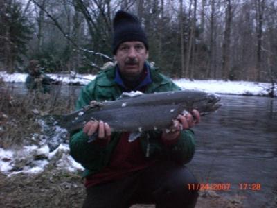 If you are looking for a different kind of fishing, the state stocked the nearby Naugatuck River with large brood stock Atlantic Salmon in October & November- hundreds have gone in. The regulations are fishing with a single hook only, no weight added on your line- weighted flies (lead wire, coneheads, beads), sinking leaders and lines are all okay though. Rules permit keeping one, but I recommend releasing them- I hear they taste like crap, and letting them go will allow many people to enjoy the catching. It helps to get your fly down in the water column a bit when fishing for them, but it is not always necessary to get down to the bottom- if they want your fly, they will usually come up for it. They are often caught on unweighted streamers & floating lines. With Winter here now, you may want to try to fish your streamers near the bottom though. There are many in the 12-15 pound range, and a decent number over 20#, as well as a few OVER 30#- that's right, over 30#. I'm talking big, hook-jawed males with massive kypes and oversize adipose fins- they almost remind me of pictures of big Russian Atlantics. There are also some nice trout present- they did an October stocking. We can send you to where the Salmon are and set you up with the proper flies & gear. I recommend at least a 6 weight rod, and a #7-9 rod would be better. Heavy tippets are the norm (I use 0x flurocarbon), and you want to either do a classic swing that swims your fly broadside across the river (let your line belly), or strip it in like you commonly would for trout- I've caught plenty both ways. Stop in and we'll hook you up.