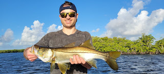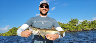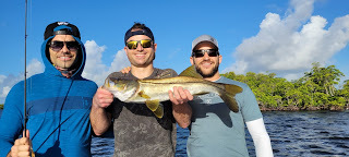 It's been an all out blitz at work with tons of charters and lots of catches so it was fitting that I wrap up this month with Andrew, Bart and their friend Andre. I've fished with these two guys before and the last time we did they thought they were dying when we got caught in a storm. Today there would be no storms just lots of wind. The plan? Hit the creeks and fish for snook. Neither of them had caught snook before and Andrew broke the ice with a nice fish he caught on a hard plastic. Bart followed up with a snook on a soft plastic and Andrew added to the total with another one. Andre caught a few fish but not snook but the list over all could've been longer as the guys missed a few bites and lost a nice snook that shook its head and spit the lure.