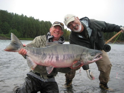The Skeena River is coloured up from the rain and is borderline fishable. The larger Sockeye are showing up now. Limit is lowered to 1 per day, 2 in possession on August 23rd. Steelhead and Coho fishing is fair. It is not uncommon to catch both Steelhead and Coho on the same day and throw in the odd Chum and Pink. This "is" the time to be out fishing on the Skeena.