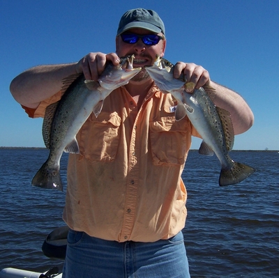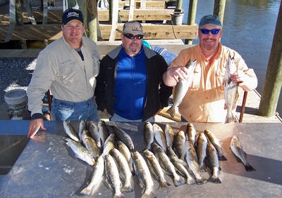 Fished yesterday with Ray Huntzicker "HUNTSZICKER OUTDOORS" and friends Brent and John. Friday was the first day after the all week cold blast and the weather was nice and warming up today. The water temps were around 46 degrees when we hit the water at 8:30 which is pretty cold. The fishing was slow until late morning when the water warmed up to 50 degrees. That was when the trout came out of their slumber and got active. We fished some shallow water adjacent to deep water and were working the baits slow and the trout were hitting them hard. All nice size fish 1 to 3 lbs. We fished all kinds of baits from live cocahoe's plastics and hard baits all putting fish in the boat. This was John's first salt water trip and he had a blast Brent is the most easy going guy I ever met catch a few fish and just relaxing enjoying the day on the water . Now Ray is a fishing MANIAC he never stops and loves every minute of it. It was a great day no limits but a nice catch of quality trout.