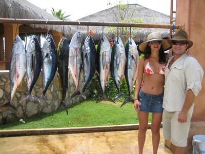 Water conditions were mostly calm with variable ground swells of four to eight feet, water temperature ranged up close to 85 degrees in the direction of the Sea of Cortez. Local pangeros are driving to La Ribera in the afternoon to net sardinas off the beach in order to supply the La Playita fleets with fresh dead sardinas, which have been the ticket for catching the yellowfin tuna, as the tuna continued to dominate the action.